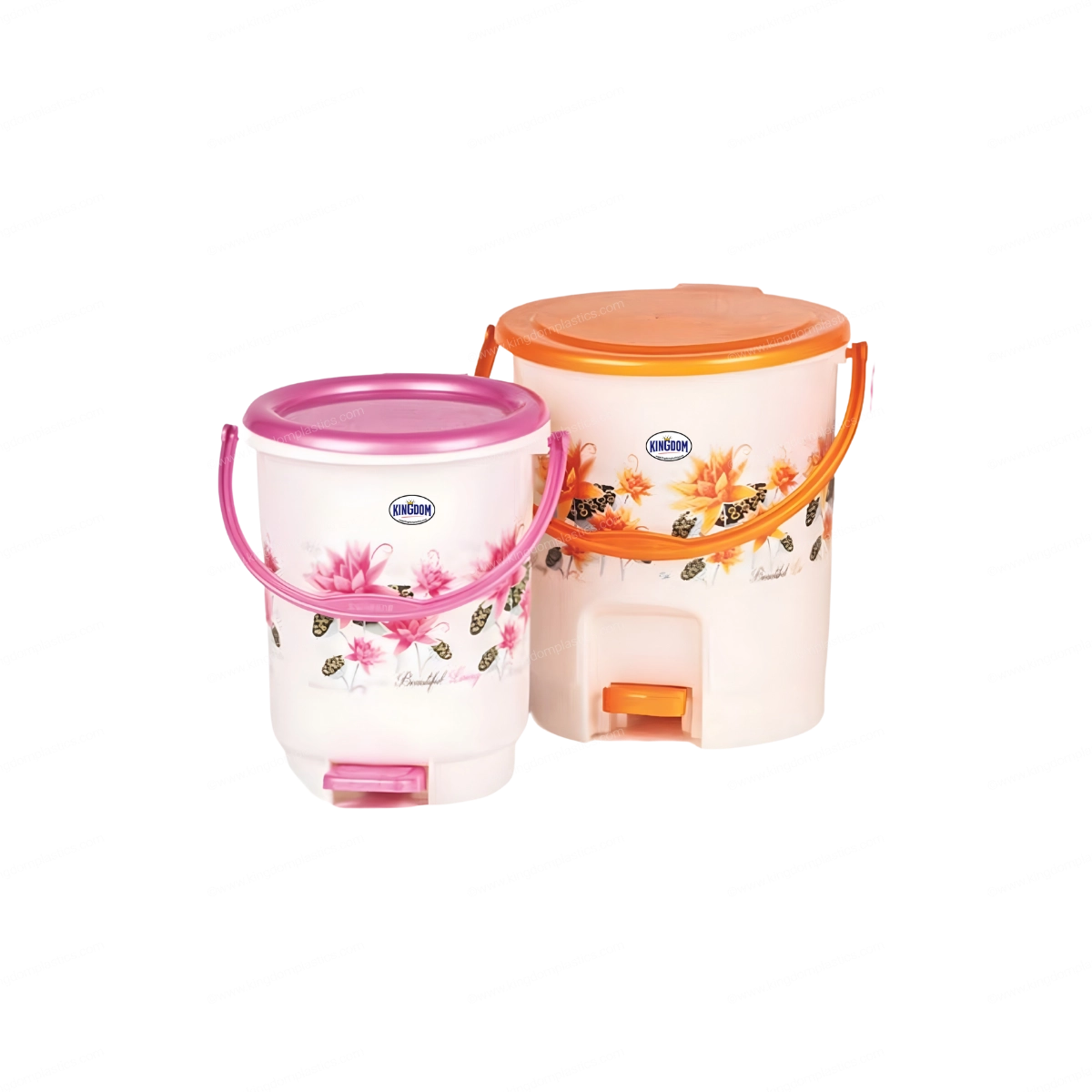 Hands-free pedal-operated dustbins with steel handles and designer floral prints, offering hygienic waste disposal without direct contact.